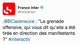 Capture d’écran 2014-11-13 à 10.37.52Depuis, hélas, les choses se sont encore aggravées.  Il y a quelques jours, sur France Inter, Bernard Cazeneuve s’interrogeait publiquement : « Mais la grenade offensive, qui vous dit qu’elle a été tirée en direction des manifestants ? »
