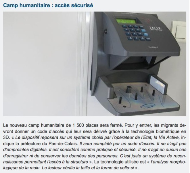 En tout cas, l’accès au camp de containers est tout ce qu’il y a de plus biométrique et les réfugiés, qui doivent échapper à une identification sur le sol français pour avoir une chance d’atteindre l’Angleterre, peuvent légitimement s’inquiéter de voir leur main devenir «une clé biométrique (chaine 300 caractères), résultat du traitement des mesures dans un algorithme spécialisé est associé au code de la personne».