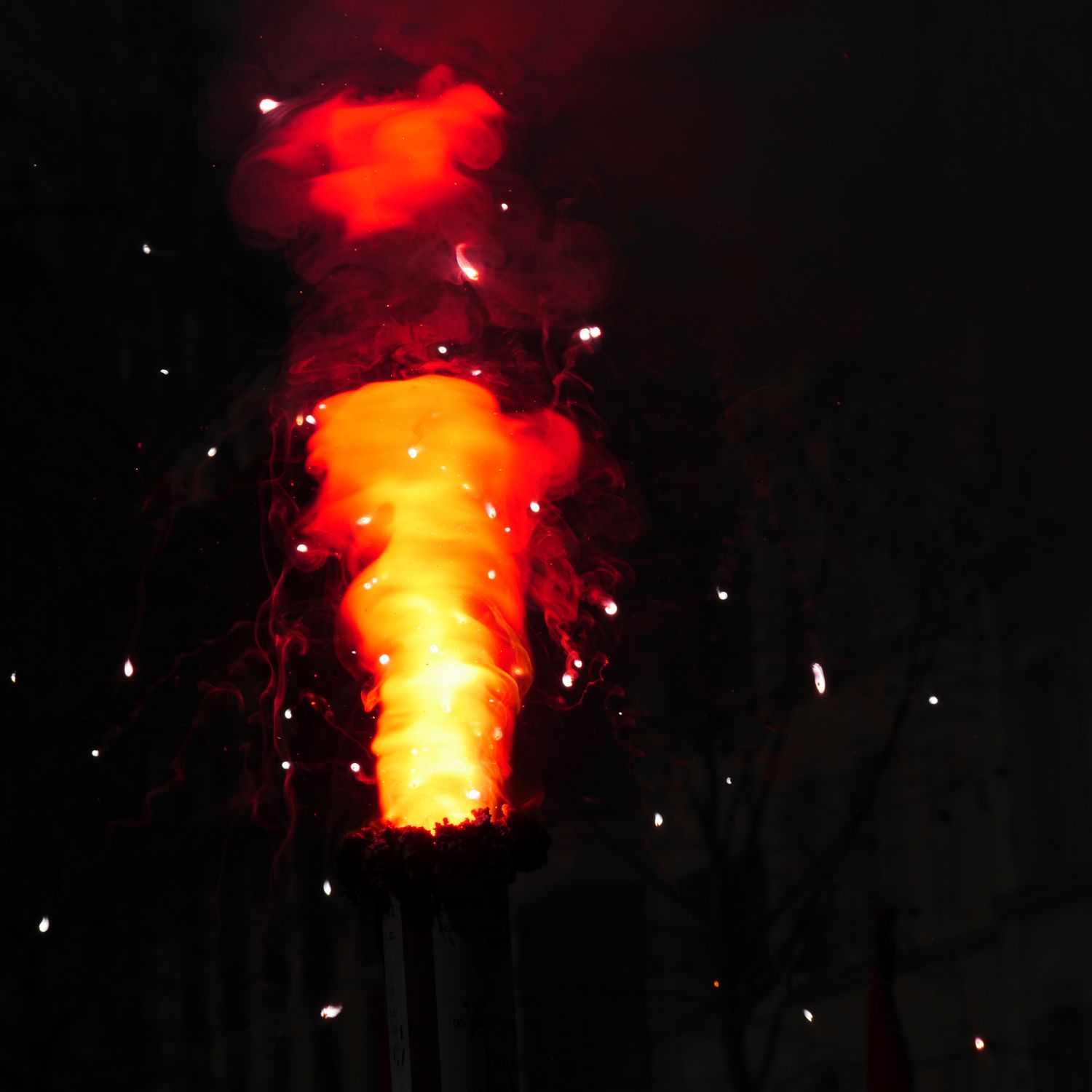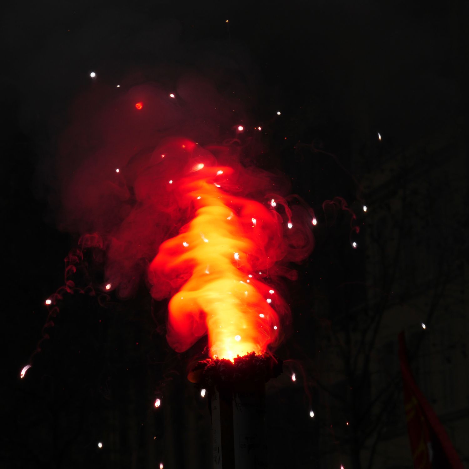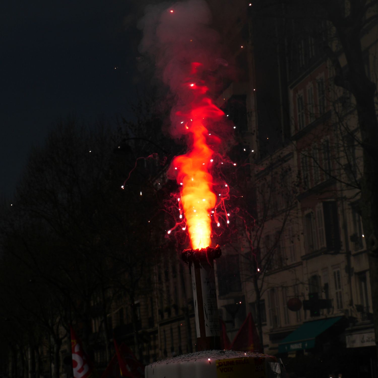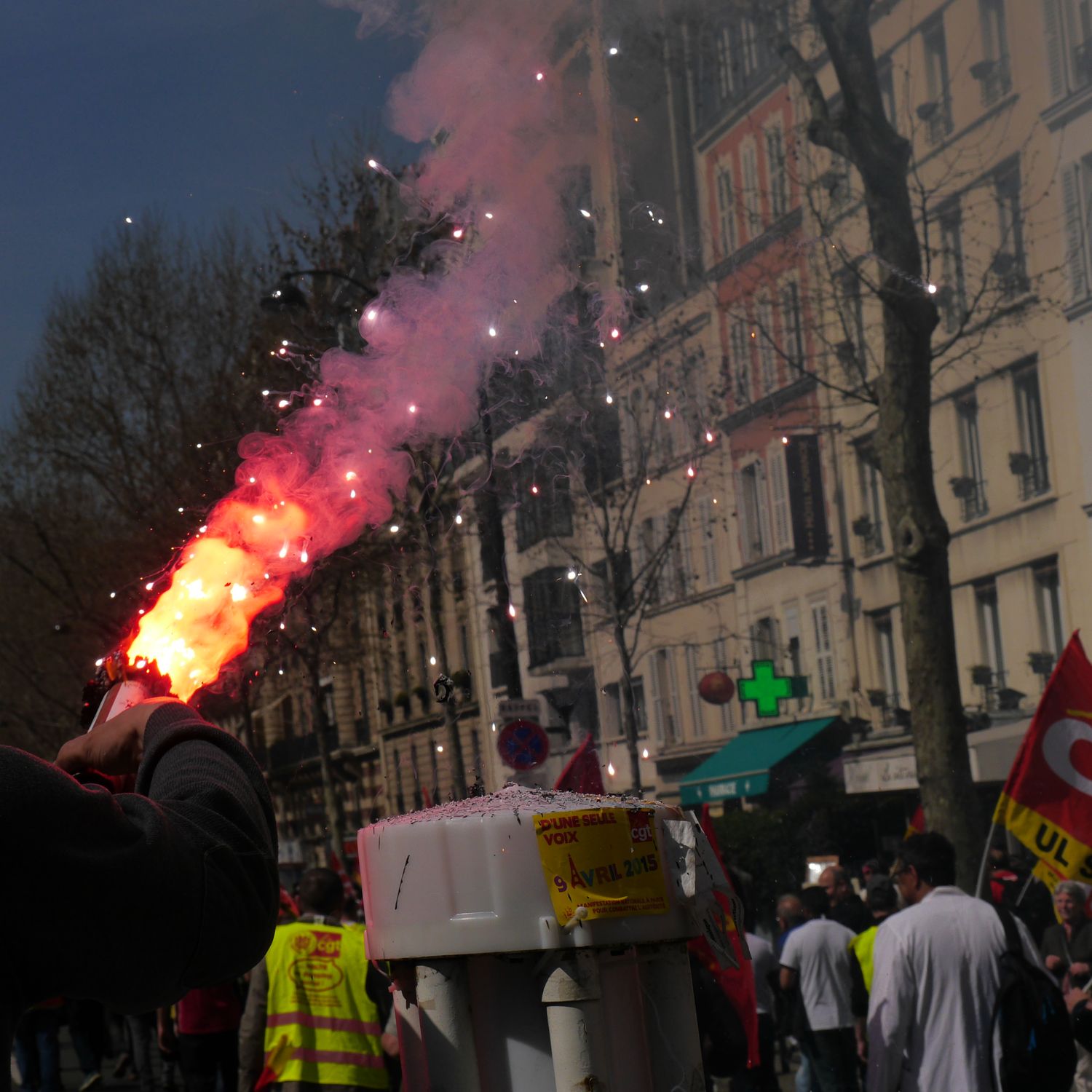 Il faisait un soleil magnifique sur le boulevard du Montparnasse. Soudain, j’ai approché mon appareil photo d’un fumigène et le monde s’est éteint. Dans le cadre, j’ai vu danser un génie rougeoyant entouré de gouttes de lumière. Un instant plus tard, un manifestant a frotté le fumigène et le génie est rentré dans sa lampe. Planche contact.